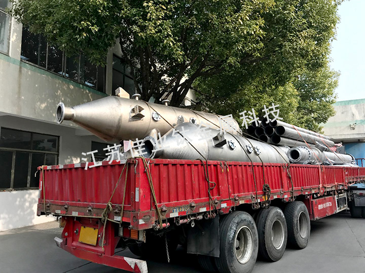 鈦材質(zhì)的殼體兩端分別設(shè)置有鈦材質(zhì)的底蓋與頂蓋,底蓋與頂蓋的內(nèi)壁均設(shè)置有一層鈦材質(zhì)的加強(qiáng)板,底蓋與頂蓋分別對(duì)應(yīng)設(shè)置有排液口及排氣口。殼體內(nèi)部由上至下依次設(shè)置有鈦絲網(wǎng)除沫器及至少兩層平行設(shè)置的篩板,鈦絲網(wǎng)除沫器與上層的所述篩板之間設(shè)置有進(jìn)液口。篩板的數(shù)量為5層,5層篩板的中心溢流孔的孔徑由上至下依次減小。鈦絲網(wǎng)除沫器的上下兩側(cè)靠近殼體的部位均設(shè)置有一圈鈦材質(zhì)的絲網(wǎng)加強(qiáng)板。